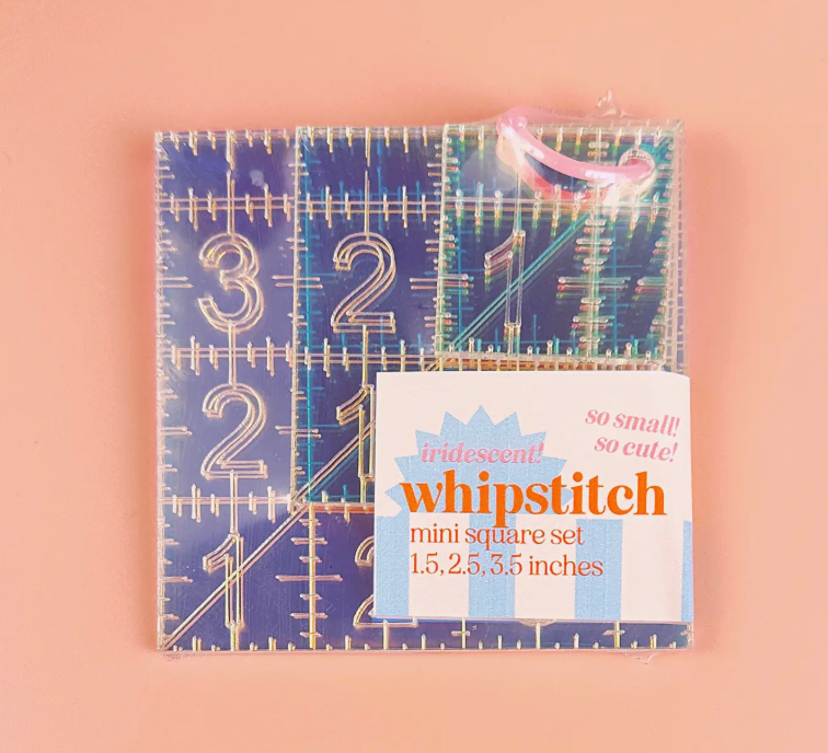 So small! So cute! And iridescent! Set of 3 mini square quilting rulers, in 1.5 inches, 2.5 inches, and 3.5 inches square. On a handy detachable ring. Markings are every 1/8 inch, with a diagonal line at 45 degrees for easy half square triangle trimming. This is a great size for trimming quilt binding! Laser cut and engraved from 1/8 inch acrylic. The markings are engraved so they'll never rub off. Non-slip dots provided with every ruler.